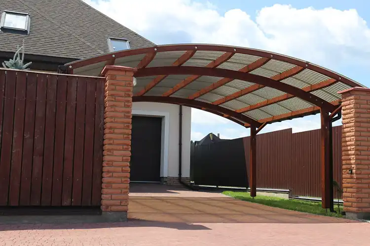 Навесы могут быть разных конфигураций и форм, но обычно стараются кровлю сделать в одном стиле с главным строением.